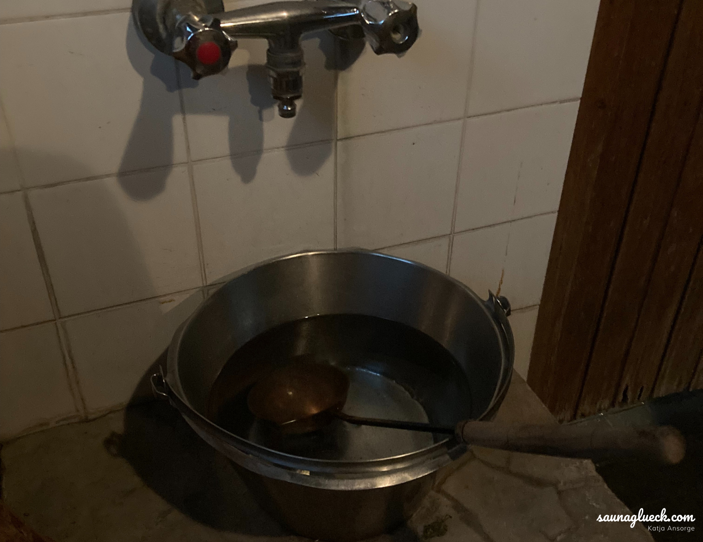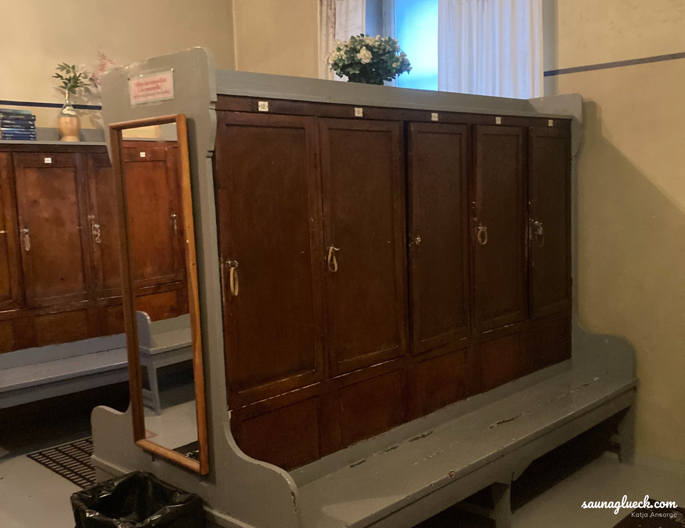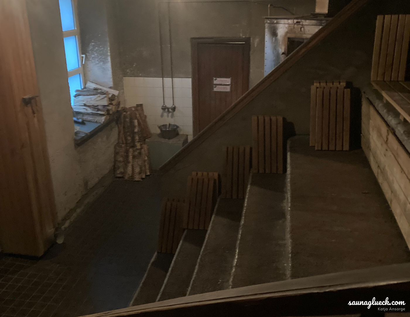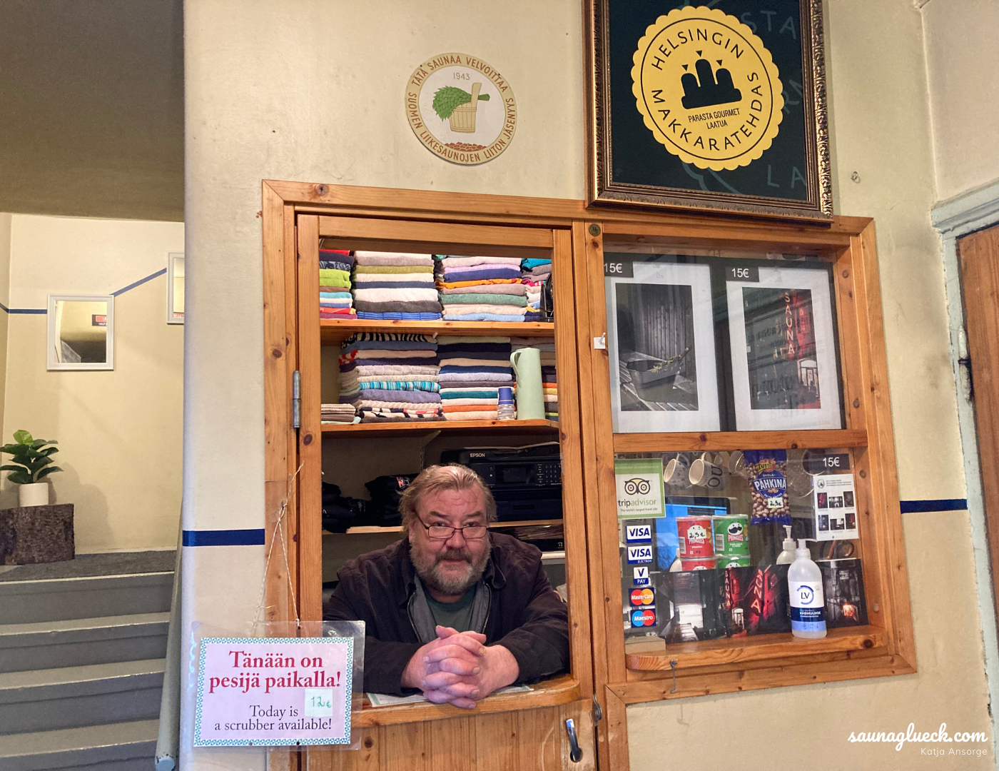 Diese Sauna ist eine der wenigen ursprünglichen Saunen Helsinkis, die…heute noch geöffnet haben. In den den 30iger Jahren gab es zwischen 150 und 200 dieser öffentlichen Saunen, die meist als Gemeinschaftssaunen in Wohngebäuden gebaut wurden. Hier wurde nach der beschwerlichen Arbeit zusammen geschwitzt, der Ärger ausgedampft und in der Gemeinschaft zusammengefunden. Sehr freundlich werde ich von Risto begrüßt. Er lugt mich aus dem kleinen Fenster im Eingangsbereich der Kotiharjunsauna an. „Heute kannst Du Dich sogar von meiner Frau Merja ganz traditionell waschen lassen“. Dieses Angebot kann ich nicht ausschlagen. Ich steige die alte Treppe ins zweite Geschoss hinauf. Hier befindet sich die sehr rustikale Damenumkleide und ich bin erst einmal allein. Es ist gerade 14:30 Uhr und außer mir sind nur ein paar Herren in der Kotiharjunsauna. Die schwitzen allerdings nach alter Finnischer Sitte in einem anderen Raum – hier in der 1. Etage. Und so habe ich die circa 20 bis 30 Plätze in der Damensauna für mich allein.
