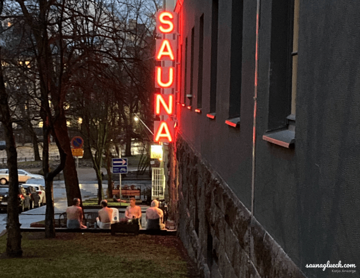 Das war ein unbeschreibliches Gefühl! So oft hatte ich es schon auf Bildern gesehen, und nun sehe ich es tatsächlich: Da sitzen dampfende Saunagäste auf der Straße Harjutorinkatu in Helsinki. Sie erzählen und lachen unter der roten berühmten Sauna-Leuchtschrift. Hier befindet sich seit 1928 die Kotiharjunsauna.