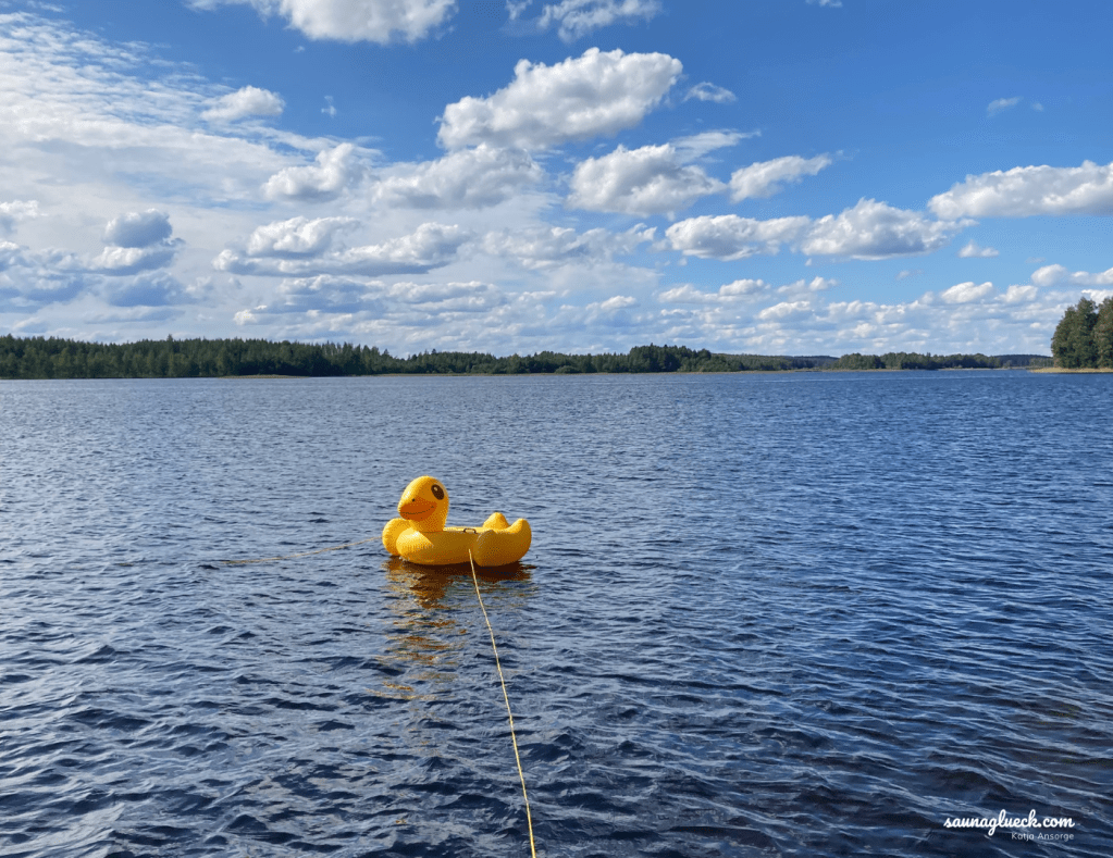 Nur noch zwei Disziplinen und so schreiten wir zum „Mökki-Spiel aller Mökki-Spiele“…dem Mölkky. Und danach? Laufen wir vorfreudig über den Schwimmsteg und springen ins klare Nass des Haukivesi. Finale Entscheidung – Wettschwimmen bis zur gelben Badeente, die munter schaukelnd an der Boje auf uns wartet. Punkt geht an mich – Juhuu!